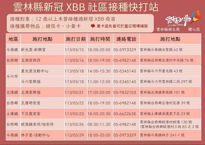 為方便縣民接種,提升疫苗涵蓋率,即日起至5月30日雲林縣特規劃新冠XBB疫苗免費接種服務,設置23場社區接種站,免收掛號費再加碼贈送精美好禮,另本縣有120家合約醫療院所分布於各鄉鎮(市),提供新冠XBB疫苗接種服務,院所接種日期、時間等資訊,歡迎登入雲林縣衛生局網站/疫苗地圖(網址: https://ylshb.yunlin.gov.tw/News.aspx?n=15251&sms=18466)查詢,以選擇方便接種的時間,前往就近的地點接種。