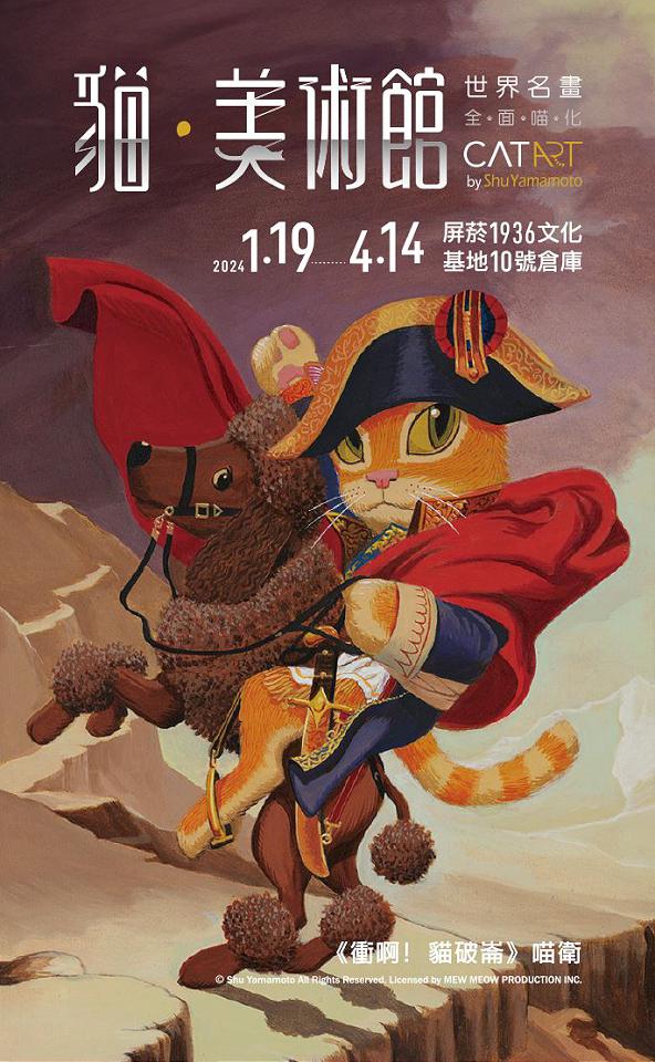 《貓•美術館–世界名畫•全面喵化 CAT ART by Shu Yamamoto》,2024年1月19日就在屏菸1936文化基地,60件療癒貓咪名畫,喵化你的視界,預售票200元11月22日上午10點開賣。另外2月2日、22日及3月22日為寵物開放日,只要遵守「寵物不落地規範」,把寵物置於籠子、背包等空間,即可與自己心愛的毛小孩同遊喵的世界。