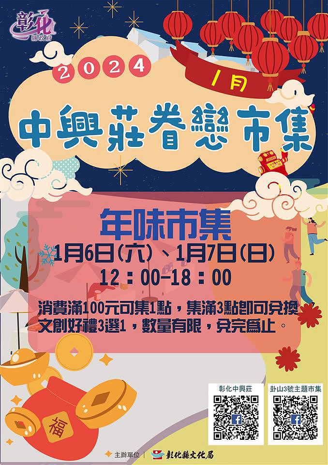 彰化縣「2024中興莊眷戀市集」年味市集將在1月6日、7日中午12點至晚間6點,於中興莊熱鬧登場,號召大小朋友相揪一起來同樂!凡在市集內消費滿100元可獲得1點,集滿3點,並追蹤文化局「彰化中興莊」及「改造彰化 創意啟航」粉絲團,經服務台人員確認後可兌換精美文創品3選1。