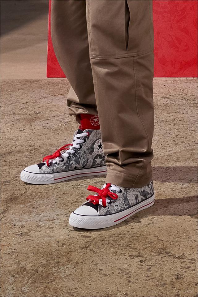 該系列包含多雙在經典鞋型基礎上煥新的龍年配色運動鞋:龍年星運One Star Pro和龍年星運悠遊All Star以米色鞋面搭配新年紅品牌標識,搭配新年特別設計龍鱗樣式鞋帶,並配以金屬龍頭裝飾精巧點綴;星運龍須Chuck 70以紅色系帶環繞鞋身,如同龍須飛舞,寓意星運時刻環繞;星運龍紋拼接Chuck 70通體呈現新年紅,鞋面多種龍紋、龍鱗印花以幾何形狀拼接,增添一分造型感 ; 星運龍影印花Chuck Taylor All Star則以黑白色龍形印花鞋面搭配紅色內襯,龍影豐富細節裝飾新年氛圍。