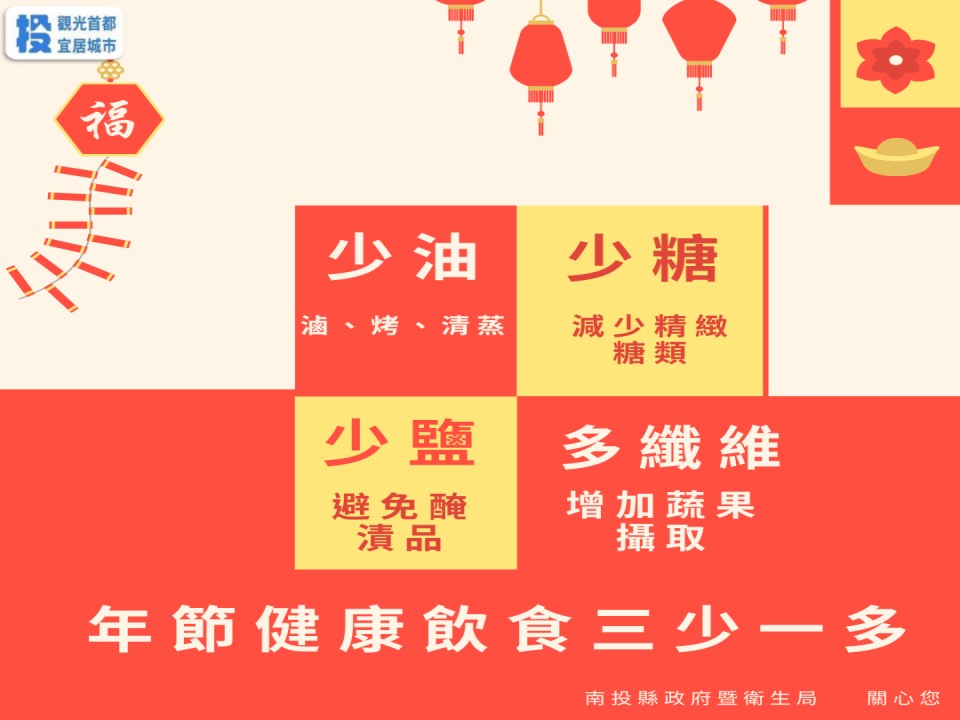 南投縣社區營養推廣中心提供年節健康飲食少油少糖少鹽多纖維三少一多原則: