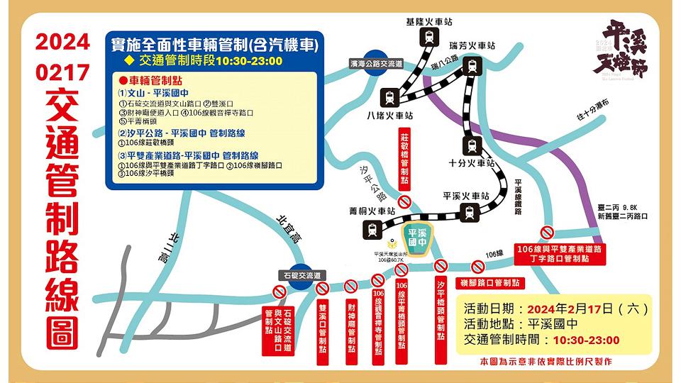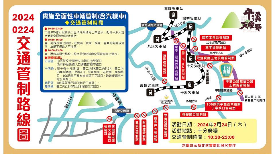 「2024新北市平溪天燈節」將於2月17日(六)平溪國中、2月24日(六)十分廣場龍重登場!為維護場域安全及因應大量人潮,讓民眾有更順暢、開心的遊程體驗,兩場活動當日10時30分至23時將實施周邊場域交通管制與提供接駁公車服務,特別安排多條路線接駁車,並與臺鐵公司協調加開或加掛車輛,呼籲前往活動的民眾利用大眾運輸工具前往會場。