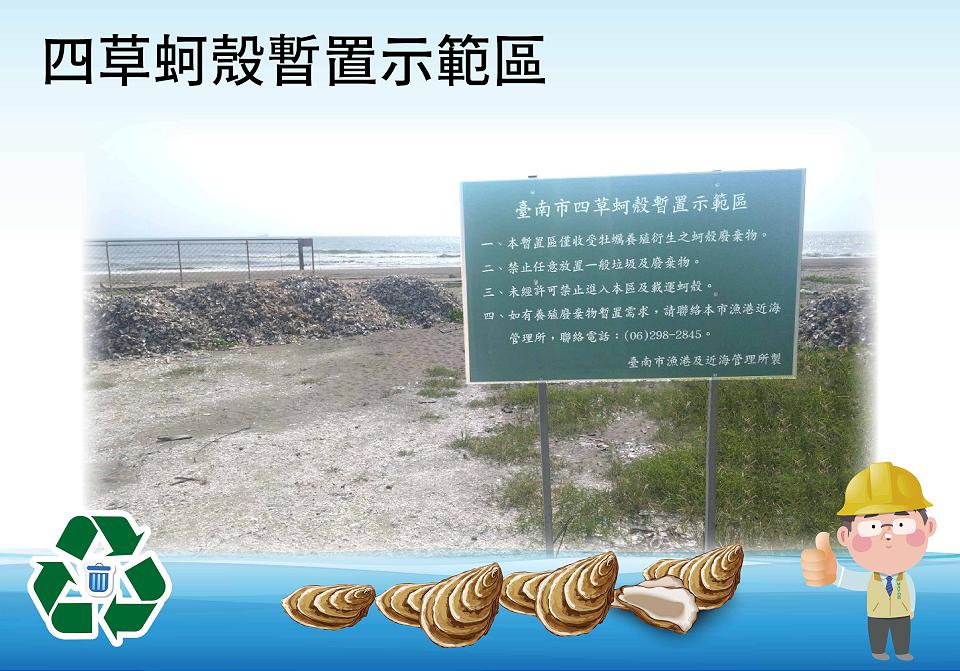 黃偉哲市長指出,市府農業局為了處理蚵殼問題,於111年7月規劃在本市安南區四草海岸設置四草蚵殼暫置示範區,面積達3580平方公尺,112年1月取得土地所有權,同年8月完成示範區設施設置工作,開放養蚵漁民將蚵殼運至該區暫置。農業局並於112年辦理蚵殼標售工作,以每噸200元價格售予得標廠商,112年已售出10.42公噸,所售出蚵殼交由台灣糖業公司的台糖生技材料廠製成蚵殼粉後,再交由下游廠商製成各式商品。