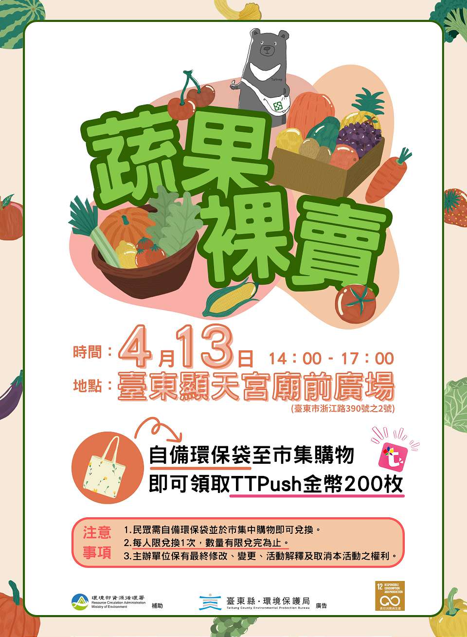 台東縣環保局為推廣源頭減塑、垃圾減量觀念,13日14時至17時舉辦「蔬果裸賣、袋來好運」活動,只要當天攜帶環保袋來台東顯天宮前廣場市集購物,不限金額,即可領取200枚TTPush金幣,限量200份,每人限領取一次,數量有限發完為止。