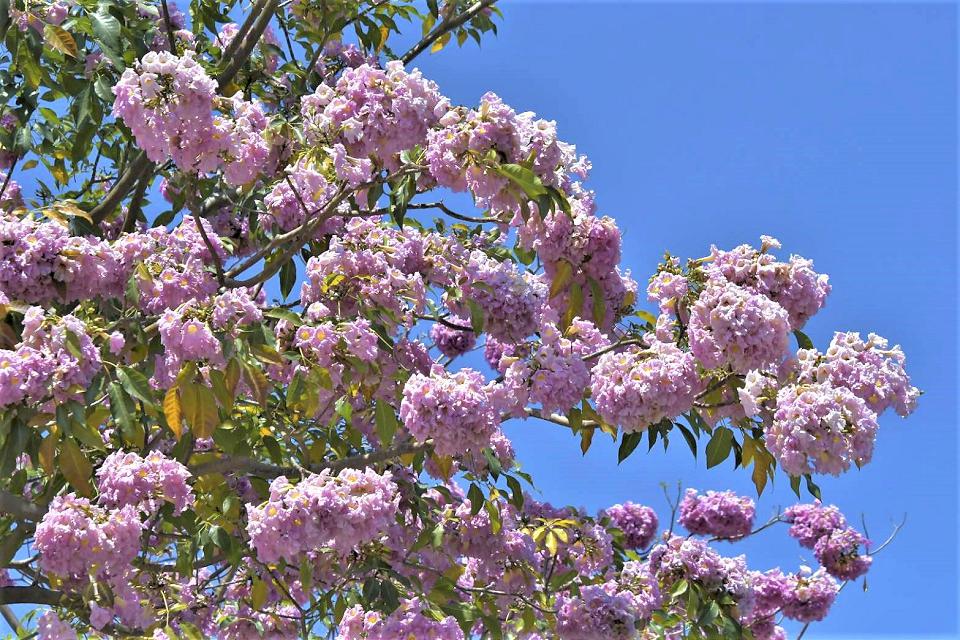 高雄市區的洋紅風鈴木盛開,紅色花朵團簇地像繡球掛在樹梢,風姿綽約足以媲美櫻花,不需要到山區就能欣賞,成為市區民眾賞花的小確幸。在中正路全線、幸福川、一心路、高楠公路、前鎮河畔及多處公園等處皆有種植,妝點高雄市區浪漫幸福的風景。