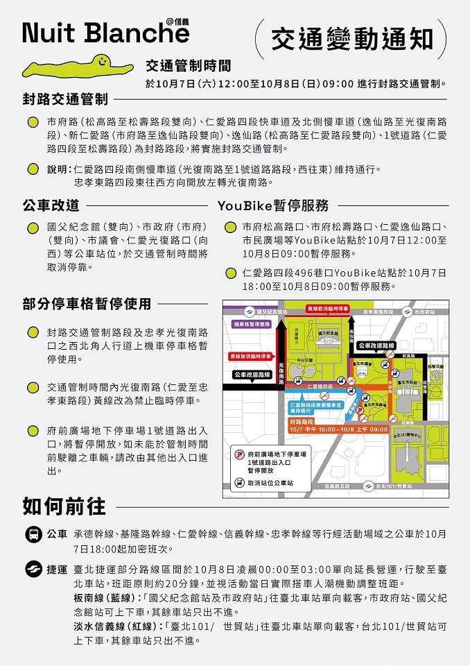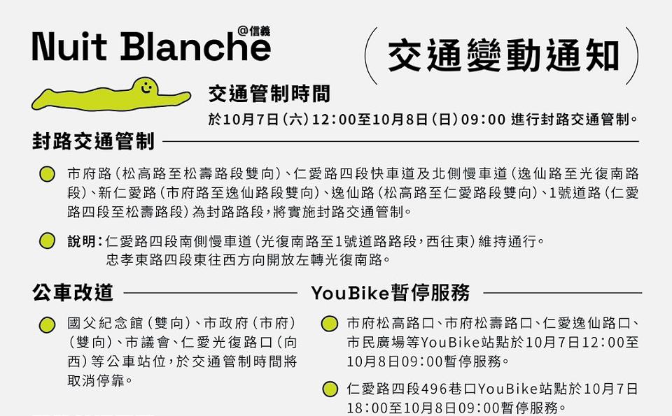 台北市政府文化局7日跨夜舉辦112年「台北白晝之夜」活動,在信義區「國父紀念館」、「台北市議會」與「台北市政府」三大場館與周邊場域展開,以「起義吧!」作為主題,信義警分局將從7日12時進行周邊交通管制,直到8日上午9時為止,請用路人遵循現場執勤員警、義交指揮。