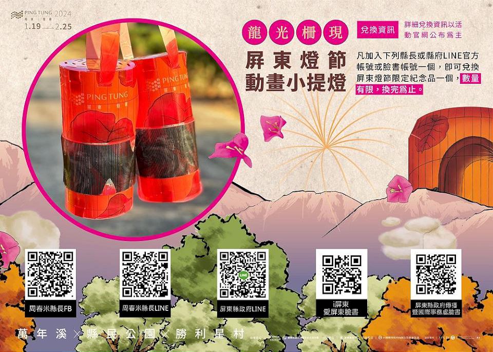 屏東縣政府推出全國第一個動畫小提燈「龍光柵現」,日前於縣民公園發放,湧入數百公尺排隊人潮,為讓各鄉鎮的民眾都能索取,將於2月1日至4日在縣內各旅遊服務中心及東港家庭福利服務中心等7處開放第二波兌換,民眾只要手機加入屏東縣政府、縣長周春米官方臉書或LINE帳號即可兌換,數量有限,趕快把握機會。