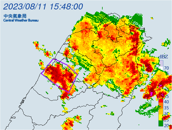 中央氣象局在11日15時13分氣象局發布雷雨編號0354大雷雨即時訊息,持續時間至16時15分;示警區域新北市烏來區。宜蘭縣宜蘭市、羅東鎮、頭城鎮、礁溪鄉、壯圍鄉、員山鄉、冬山鄉、五結鄉、三星鄉、大同鄉。