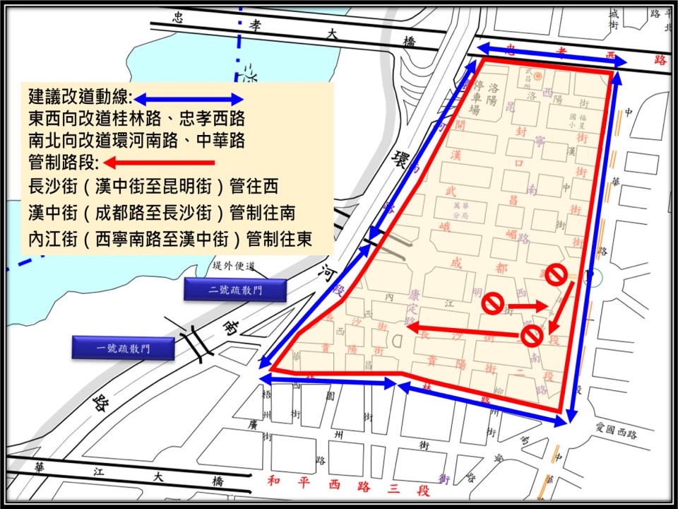(一) 長沙街(漢中街至昆明街路段)管制車輛往西行駛。