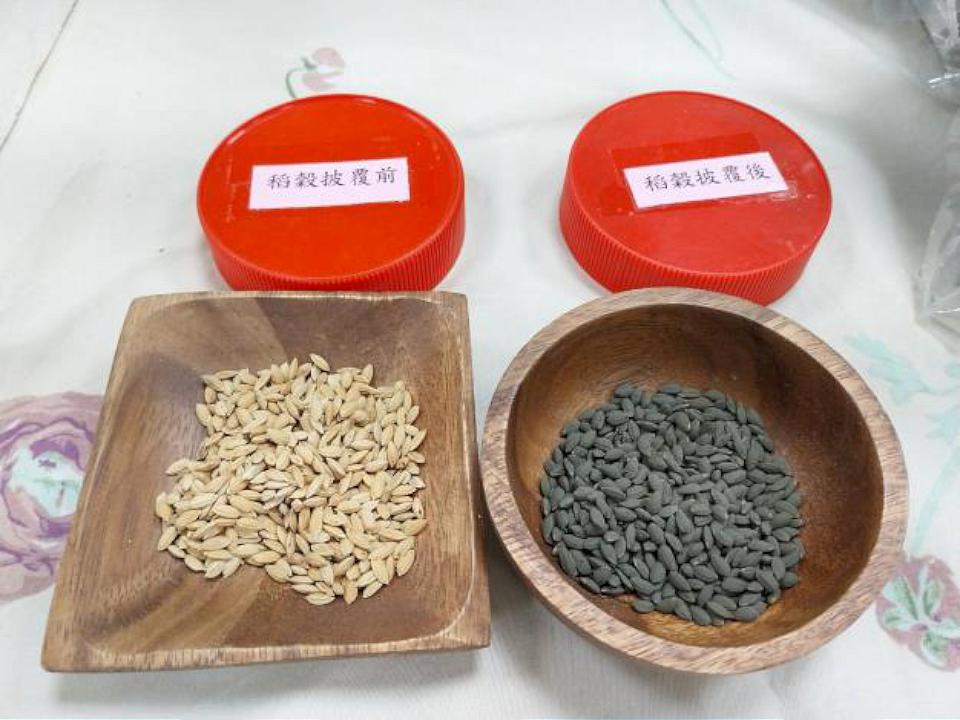稻種裹上鐵粉後,呈現深褐色且適口性差,將不易被鳥發現及取食的機會。翻攝台南市政府