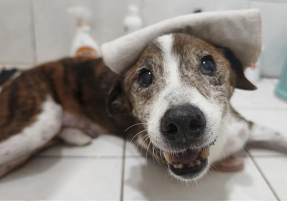 董姓志工為「瑞瑞」設計了水管輪椅,在家中細心照料並進行訓練。翻攝新北市動保處