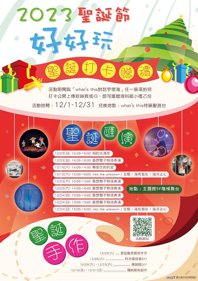 國立海洋科技博物館在2023年即將進入尾聲,加上12月聖誕溫馨的日子,特別在12月的假日提供豐富多元與溫馨的活動,讓入館的民眾享有好玩和歡樂的入館氣氛。12月16日將登場的「聖誕匯演」分別有雨韻合唱團的「槲寄生的約定」,以及由崇右影藝大學帶來的《into the unknown》、《北極》、《海有我在》以及《海洋之心》海洋音樂劇演出。