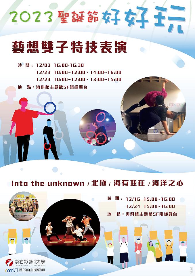 國立海科館表示,崇右影藝大學《海有我在》一劇,榮獲2023年海洋保育創意戲劇競賽社會組第二名,將為觀眾帶來感動的海洋保育故事與好聽的歌聲。12月在海科館內推出一系列令人驚艷的表演活動和融合科技與藝術的盛宴,有藝想雙子的特技表演以及《into the unknown》、《北極》、《海有我在》等戲劇演出。這些表演活動適合大、小朋友觀賞。來館民眾有機會欣賞到高水準的特技展示、深具情感的戲劇演出,以及動聽的《海洋之心》演唱,將為大家的假期增添了一抹豐富多彩的色彩。
