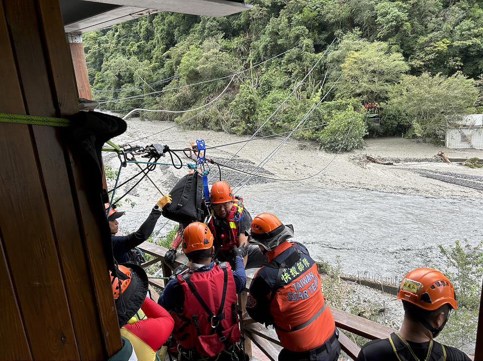 在廬山溫泉區受困的民眾中,有年紀未滿1歲的嬰兒,也有70歲的長者,搜救人員在兩岸的繩索系統一拉一送中,將55人全數救出。(記者余珩維/南投報導)