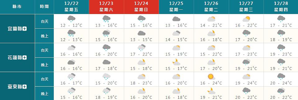 22日(五)受到寒流影響,中部以北、東北部及東部天氣非常寒冷,低溫橙色燈號地區有新北市、基隆市、台北市、桃園市、新竹縣、宜蘭縣、金門縣有持續10度左右氣溫發生的機率,連江縣有持續6度左右氣溫發生的機率。東北部、東南部地區、恆春半島及桃園以北山區有局部短暫雨,大臺北、東部地區及中南部山區亦有零星短暫雨,其他地區為多雲。