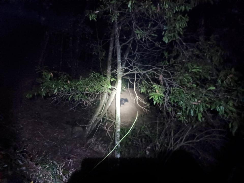 根據了解,當時第一批森林護管員接獲通報後,緊急前往松茂林道搜尋黑熊蹤跡,由於牠受困地點行走困難,森林護管員直到傍晚4時許才抵達,果然發現黑熊右腳遭陷阱繩索套住,經回報後第二批護管員及遠在130公里外的生物多樣性研究所獸醫師團隊,摸黑上山前往黑熊受困位置。