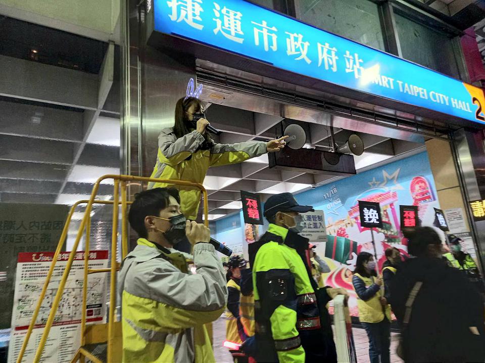 台北捷運人員在人潮擁擠的捷運站舉牌提醒(資料照)。翻攝台北捷運公司