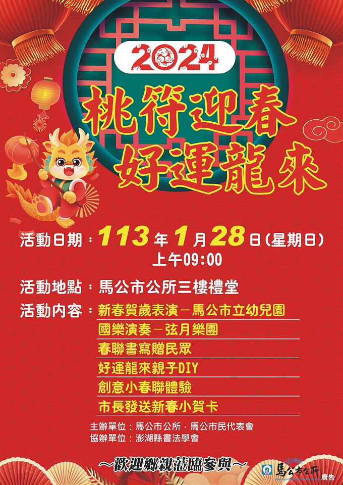 澎湖縣馬公市公所每年於歲末年終、農曆春節前,為民眾舉辦的春聯書贈活動,將於1月28日(日)上午9時在市公所3樓禮堂舉辦『桃符迎春、好運龍來』活動,以延續節慶民俗文化,帶動春節喜慶氛圍,竭誠邀請民眾蒞臨參與。另外113年1月1日起至1月25止在指定底點拍照上傳官網臉書,並標記2位好友就可參加紅包袋抽獎。