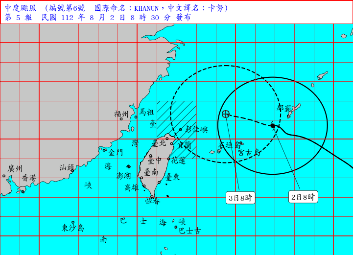 卡努颱風2日8時30分距離在台北東方約550公里海面上,以每小時12轉7公里速度,向西北西進行,過去3小時強度略為增強,以達中度颱風上限,中央氣象局表示,最快不排除傍晚發布陸上颱風警報。