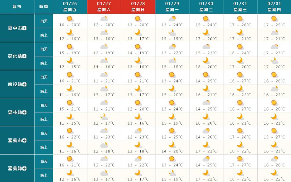 27日(六)、28日(日)寒流逐漸減弱,北部及東北部天氣仍寒冷,其他地區早晚亦寒冷,中南部日夜溫差大;環境仍為偏東北風,迎風面台灣北部、東半部地區、中南部山區及金門有局部短暫雨,其他地區及澎湖、馬祖為多雲到晴。桃園至雲林沿海空曠地區及恆春半島、蘭嶼、綠島、澎湖易有較強陣風,請注意。