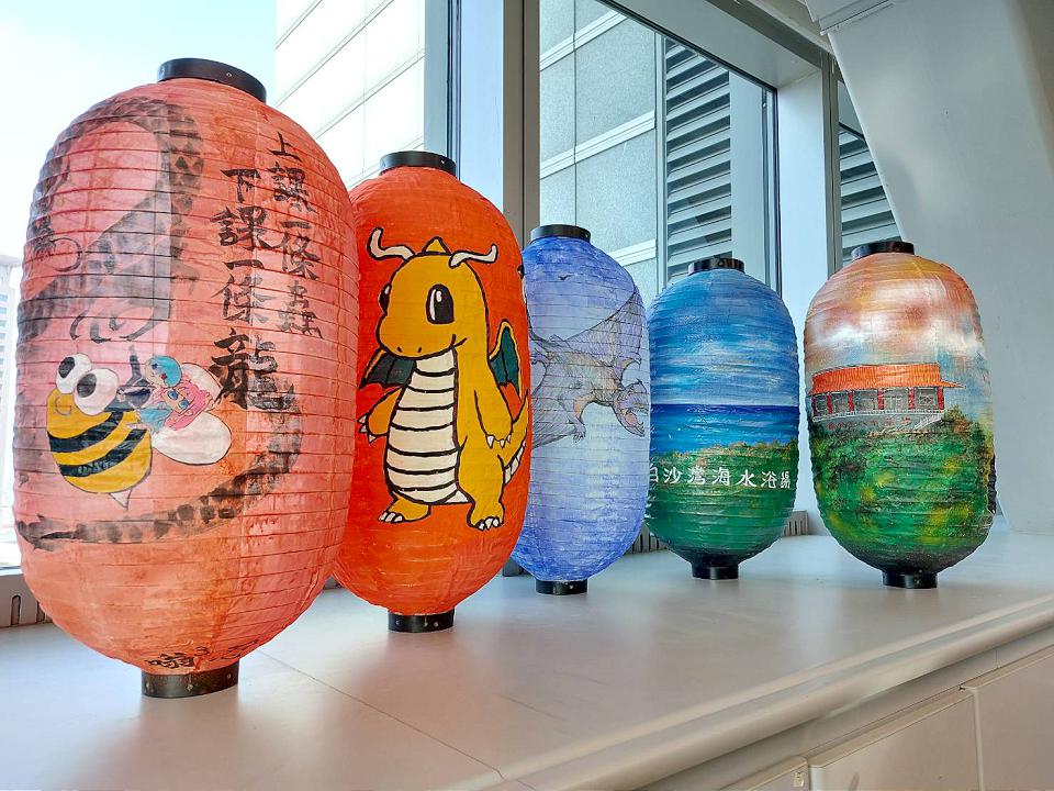 年彩繪燈籠有圓型及冬瓜型兩款,不論是名家的、喜氣的、童趣的、素雅的畫作應有盡有,相當豐富多元。圓形燈籠將以祈福燈塔展出,冬瓜型燈籠則打造日式燈籠牆廊道,增添新春濃濃年味。除了傳統典雅的燈籠圖案,許多學子也搭著龍年主題應景做畫,什麼龍都出籠,有寶可夢「快龍」、「劍龍」、「飛龍在天」、「魚躍龍門」,「淡水神龍」、「舞龍舞獅」等,更有同學以「上課一條蟲、下課一條龍」發想創意,讓人看了會心一笑。