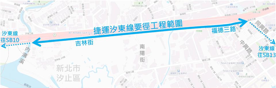新北捷運局長李政安表示,為解決計畫道路寬度不足問題,並考量捷運汐東線墩柱位置,及改善汐止至內湖地區的交通壅塞情形,汐東線要徑工程拓寬汐止區吉林街與福德三路,將長度1.4公里現況僅6~8公尺的道路寬度,拓寬成16 公尺,期許舒緩交通量提升服務水準,兼顧捷運行經所需空間。