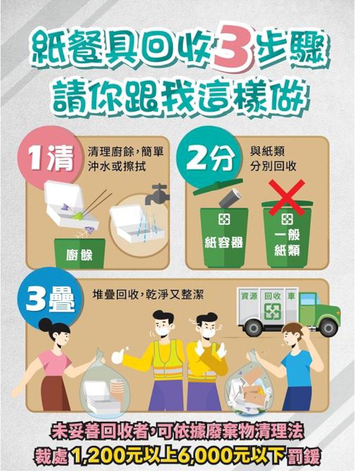另外,紙餐具(如杯、碗、盤)為備具防水及防油漬功能,生產時會於紙盒內面塗上一層薄塑膠淋膜,因此回收處理程序與紙類不同,請民眾依「清、分、疊」3步驟,清理、分類、堆疊廢紙容器,並與紙類區分交付回收。(記者劉逸撰/屏東報導)