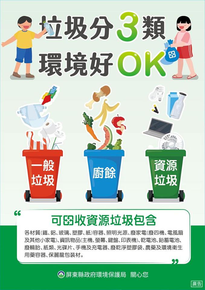 屏東環保局表示,依據廢棄物清理法,家戶垃圾排出前應分「一般垃圾」、「資源垃圾」和「廚餘」等3類,才能交給清潔隊清除,未依規定分類者清潔隊可拒收,對於屢勸不聽者,不排除依違反廢棄物清理法規定處以新臺幣1200至6000元罰鍰。