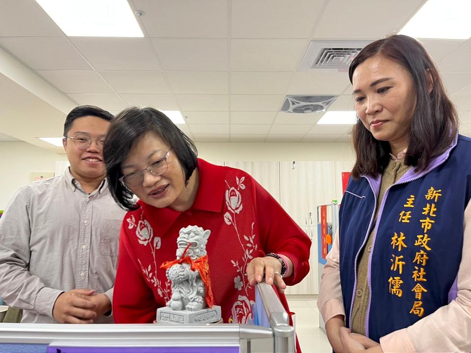 文山社福中心社工曾郁鈞(左)在桌前擺放一隻大風獅爺,李美珍局長(中)關心他的案量是不是很多。翻攝新北市政府