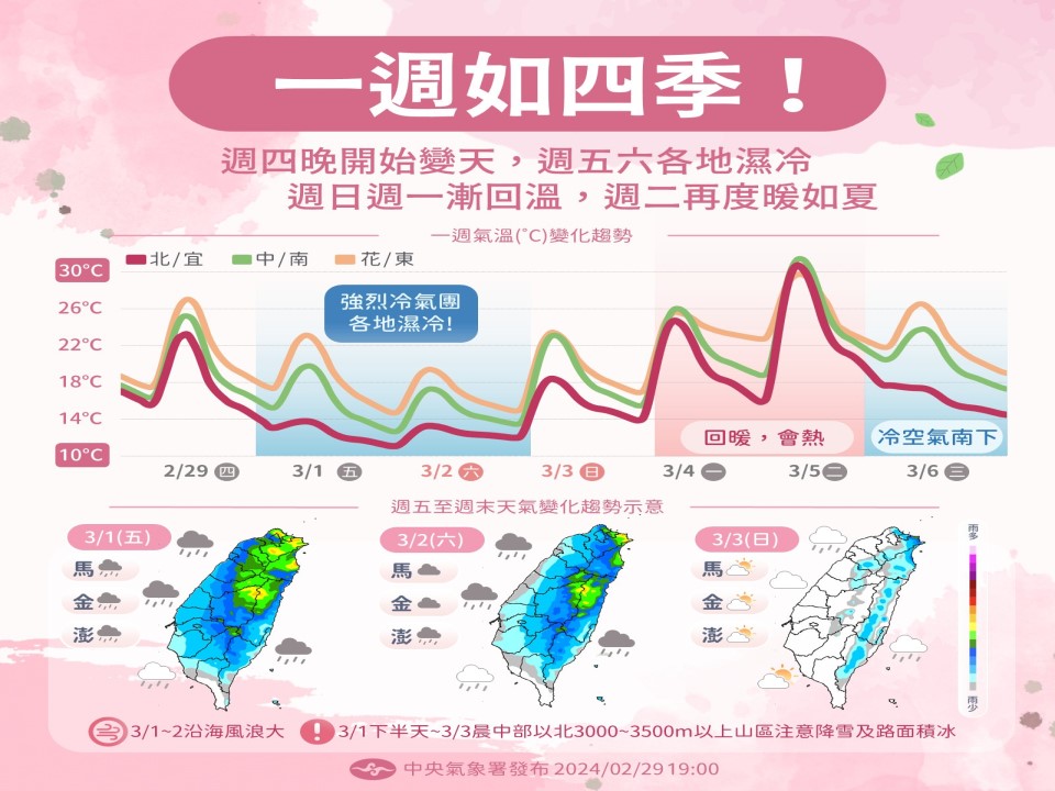 中央氣象署表示,未來一週的天氣有如四季般冷熱交替,週末2天氣溫直直落,部分地區還會降到10度以下,降雨方面華南雲雨區東移,天氣濕冷,北部、東北部地區及中部山區有雨,基隆北海岸及中部以北山區有局部較大雨勢發生的機率,週一回暖2天後冷氣團報到再次降溫。