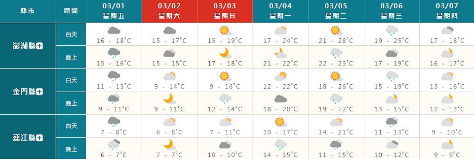 2日(六)強烈大陸冷氣團影響,尤其清晨冷空氣達最強,北部及東北部低溫普遍只有10到11度,中部12至14度,南部及花東14至16度,其中台中以北及金門、馬祖有局部10度以下低溫,請大家要注意保暖。天氣方面,配合華南雲雨區東移,白天各地降雨機率仍高,北部、東北部地區及中部山區有雨,基隆北海岸及中部以北山區有局部較大雨勢發生的機率,其他地區亦有局部短暫雨,晚上起水氣將逐漸減少。