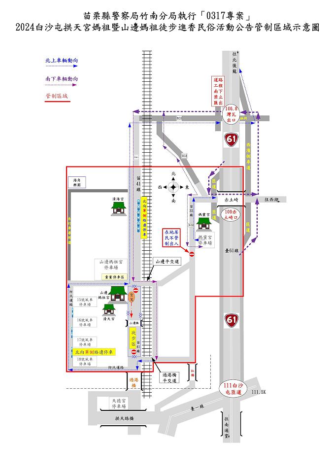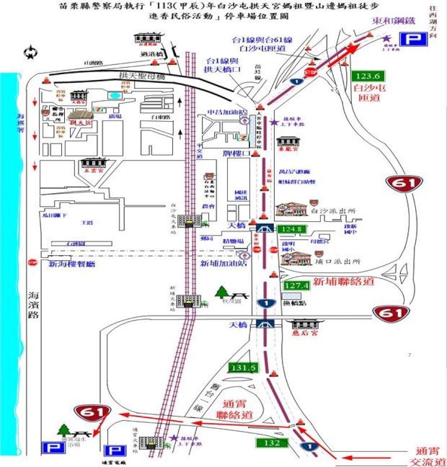 7、通霄鎮白東里拱天宮牌樓至白沙屯拱天宮媽祖廟及山邊媽祖廟周邊亦進行道路交通管。
