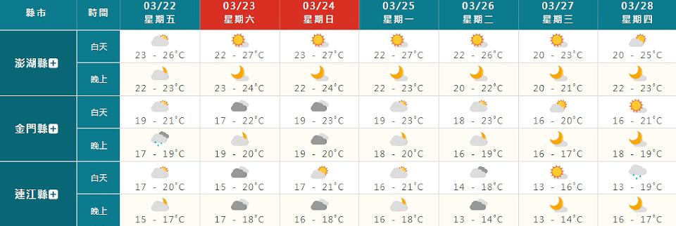 週六至週一(23日至25日)大環境將由東南風轉為偏西南風逐日回暖,白天高溫夜晚低溫也明顯回升;週末各地白天都來到30度左右,內陸、近山區還會再更高一些,各地天氣大致晴朗穩定,僅花東地區及恆春半島有零星短暫陣雨,因午後熱力作用,在西半部山區有零星短暫陣雨的機率,週日(24日)、週一(25日)東北部地區亦有午後陣雨的機率;這段時間夜晚清晨要留意低雲或霧的影響,在下週二清晨之前金門、馬祖及西半部地區易有能見度較低的情況,尤其金馬地區濃霧影響時間較長,行車用路、往返離島請留意相關交通資訊。