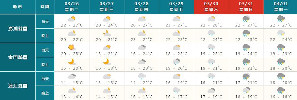 週四(28日)東北季風減弱氣溫回升,北台灣高溫重回28度左右;週四白天起水氣增多,除東半部地區有局部短暫陣雨外,其他地區雲量亦增多;週四晚間至週五(29日)微弱鋒面通過,東半部及北部地區有局部短暫雨,鋒面通過後沒有伴隨顯著冷空氣,故各地氣溫變化不大。