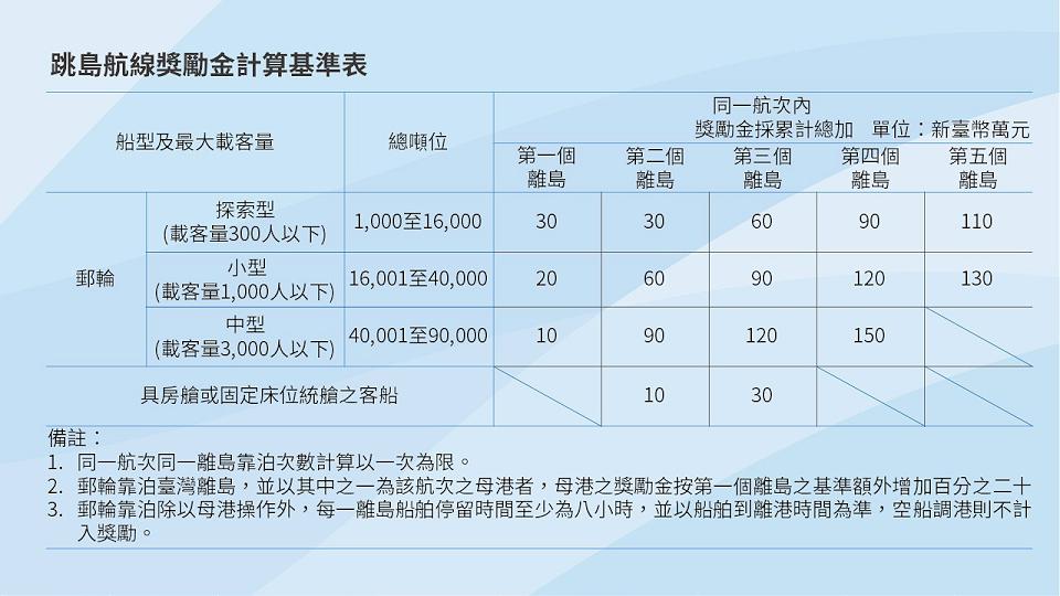 航港局局長葉協隆表示,為了吸引更多郵輪靠泊台灣的離島,及推動我國客船經營跳島航線,已於3月26日修訂發布「交通部航港局推動跳島航線推廣獎助要點」,針對不同的郵輪噸位及郵輪靠泊離島的次數,設定相對應的獎勵金發放基準表,並採用累加方式給予獎勵金。以總噸位5000的探索型郵輪為例,靠泊1個離島每航次可申請30萬元,2個離島每航次總計可申請60萬元。
