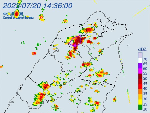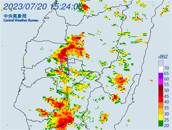 中央氣象局7月20日16時54分發布雷雨編號0242大雷雨即時訊息,持續時間至18時0分;示警區域新竹縣五峰鄉,苗栗縣南庄鄉、泰安鄉。請慎防劇烈降雨、雷擊,溪(河)水暴漲,低窪地區慎防淹水,以及低能見度。