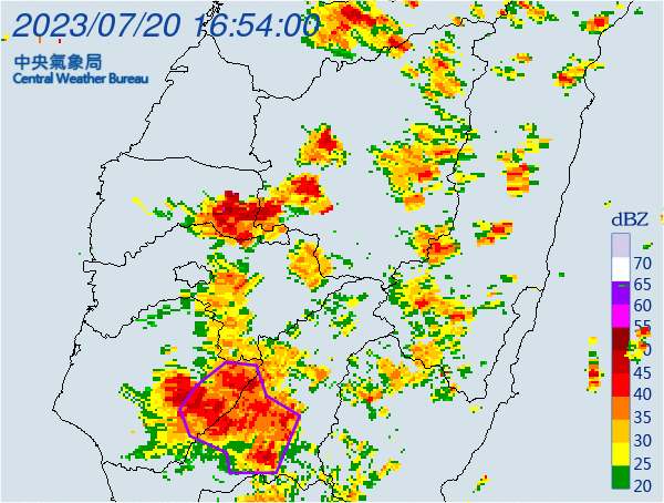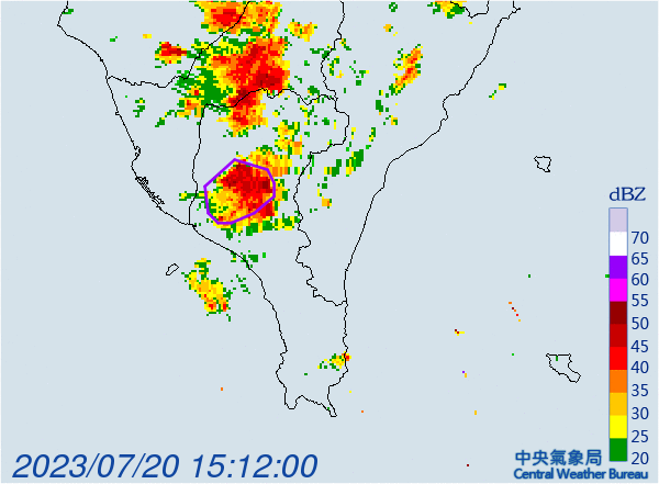 中央氣象局7月20日17時33分發布雷雨編號0245、雷雨編號0246、雷雨編號0247大雷雨即時訊息,持續時間至19時15;示警區域台南市大內區、山上區、玉井區、官田區、新化區、善化區、新市區、安定區、左鎮區,高雄市大樹區、大社區、仁武區、鳥松區、燕巢區、旗山區,屏東縣    屏東市、長治鄉、九如鄉、里港鄉、鹽埔鄉。。請慎防劇烈降雨、雷擊、9級以上強陣風,溪(河)水暴漲,低窪地區慎防淹水,以及低能見度。