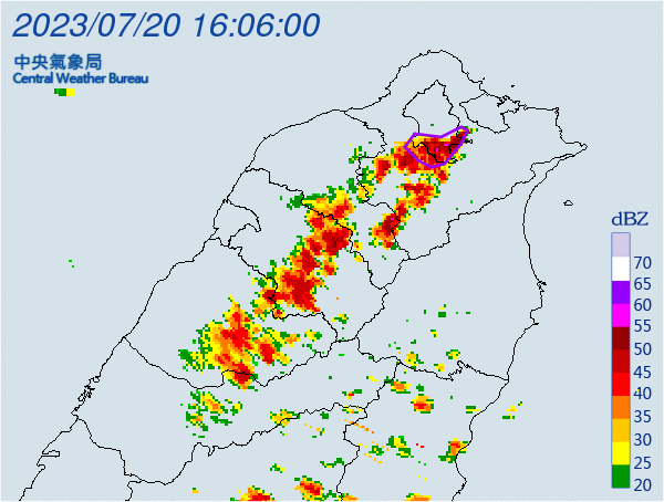 中央氣象局7月20日16時16分發布雷雨編號0241大雷雨即時訊息,持續時間至17時15分;示警區域台北市信義區、大安區、中正區、萬華區、文山區、南港區,新北市中和區、永和區、新店區、汐止區、深坑區。請慎防劇烈降雨、雷擊,溪(河)水暴漲,低窪地區慎防淹水,以及低能見度。