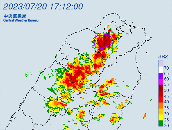 中央氣象局7月20日17時22分發布雷雨編號0244大雷雨即時訊息,持續時間至18時15分;示警區域台北市大安區、中正區、大同區、萬華區、文山區,新北市板橋區、三重區、中和區、永和區、新莊區、新店區、樹林區、鶯歌區、三峽區、土城區、泰山區,桃園市龜山區。請慎防劇烈降雨、雷擊,溪(河)水暴漲,低窪地區慎防淹水,以及低能見度。