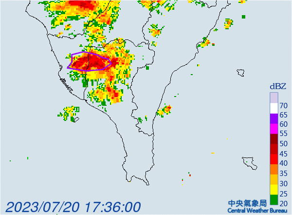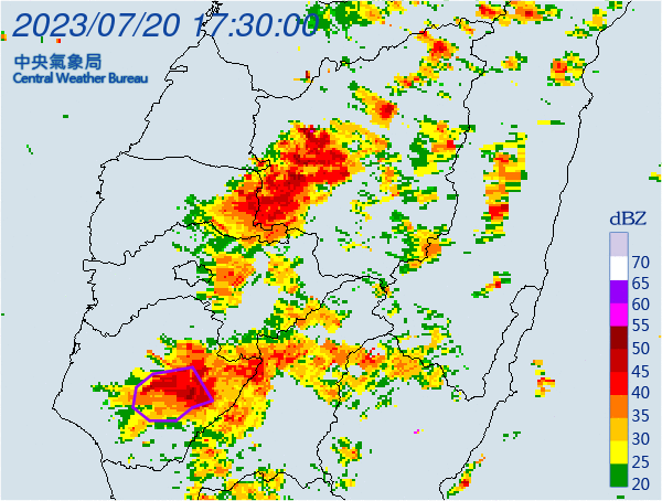 中央氣象局7月20日17時2分發布雷雨編號0243大雷雨即時訊息,持續時間至18時30分;示警區域台南市大內區、山上區、玉井區、楠西區、南化區、左鎮區,高雄市旗山區、美濃區、六龜區、甲仙區、杉林區、內門區、茂林區、桃源區。請慎防劇烈降雨、雷擊,溪(河)水暴漲,低窪地區慎防淹水,以及低能見度。