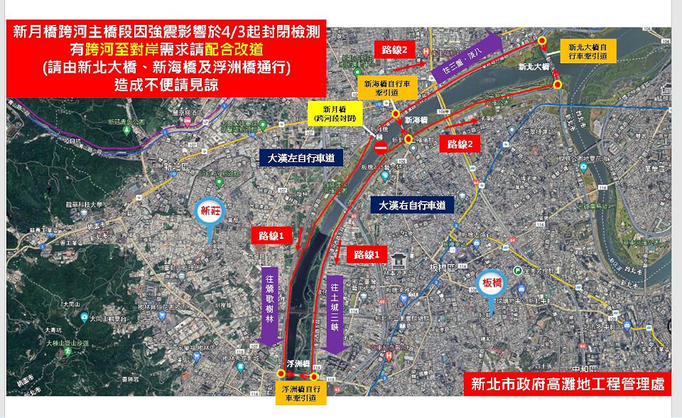 連接新北市板橋及新莊的景觀橋「新月橋」,在這次花蓮強震影響下,發現橋上有吊索鬆脫狀況,考量後續餘震不斷,為維民眾安全,管理單位高灘地工程管理處於4月3日下午起封閉新月橋主橋段,請民眾改道通行。