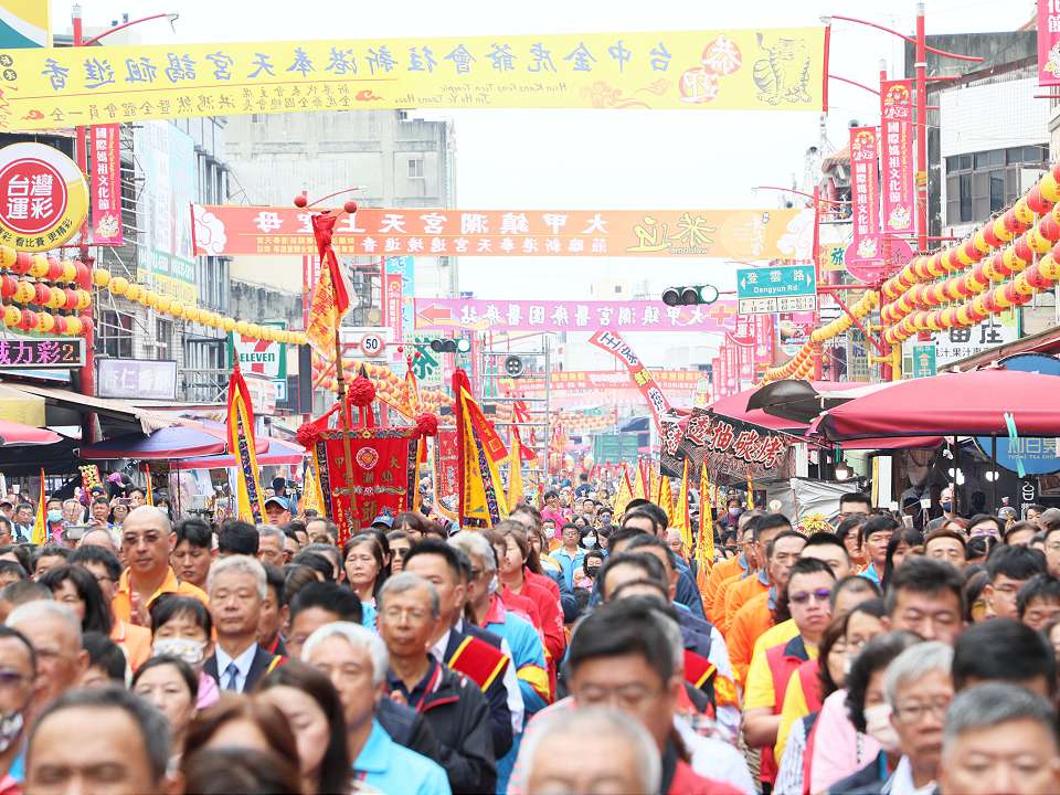 大甲鎮瀾宮媽祖4月5日23時起駕,沿途行經台中市、彰化縣、雲林縣及嘉義縣,所到之處信徒都虔誠跟隨,9天8夜遶境進香在信眾恭迎下,9日凌晨駐駕嘉義新港奉天宮,上午8點舉辦媽祖祝壽大典,儀式全程兩小時,由主祭們率領在場數萬信徒,一起遵循古禮為媽祖上香、獻花、獻果、誦經及行三跪九叩禮,祝賀媽祖萬壽無疆,典禮尾聲由廟方準備豬公祭拜,提供豬肉讓信眾領取。
