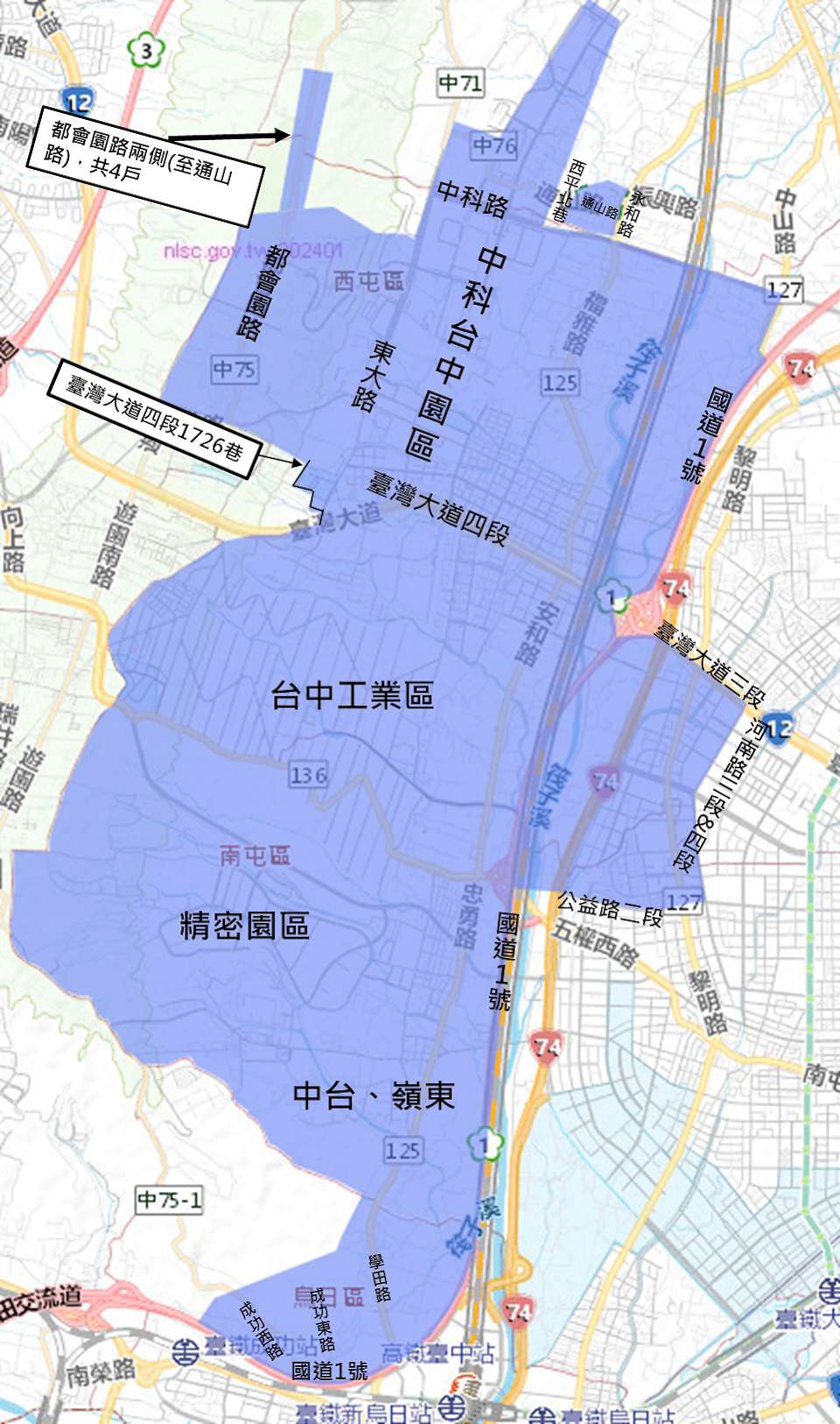 台中4月14日-15日停水範圍。翻攝台中市政府。