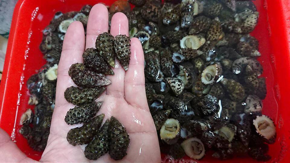 北海岸沿線的潮間帶,常見一種外型肥短呈筍狀,顏色呈黑褐色,表面具瘤狀突起,棲息於岩礁及藻礁之潮間帶螺類,居民稱之為尖尾螺,他們採集來常用海水吐沙,煮熟後再用針將螺肉挑出來直接品嚐鮮脆原味,當然還有一種常見料理,拌炒醬油、蒜頭、辣椒等,竟成為許多饕客喜歡的「燒酒螺」