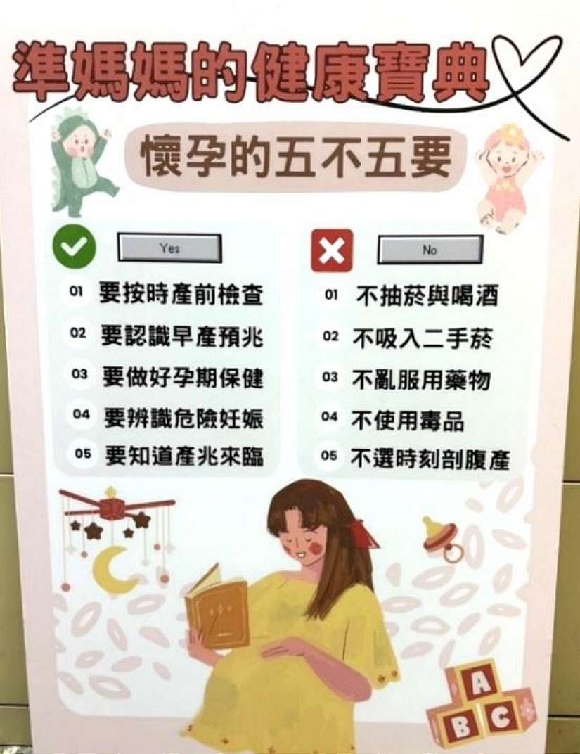 衛生局長殷東成提醒孕媽咪們,除定期接受14次產檢外,另要遵守懷孕的「5 要 5 不」健康守則:「要按時產前檢查、要認識早產預兆、要做好孕期保健、要辦識危險妊娠、要知道產兆來臨」;「不抽菸與喝酒、不吸入二手菸、不亂服用藥物、不使用毒品、不選擇時刻剖腹產」。