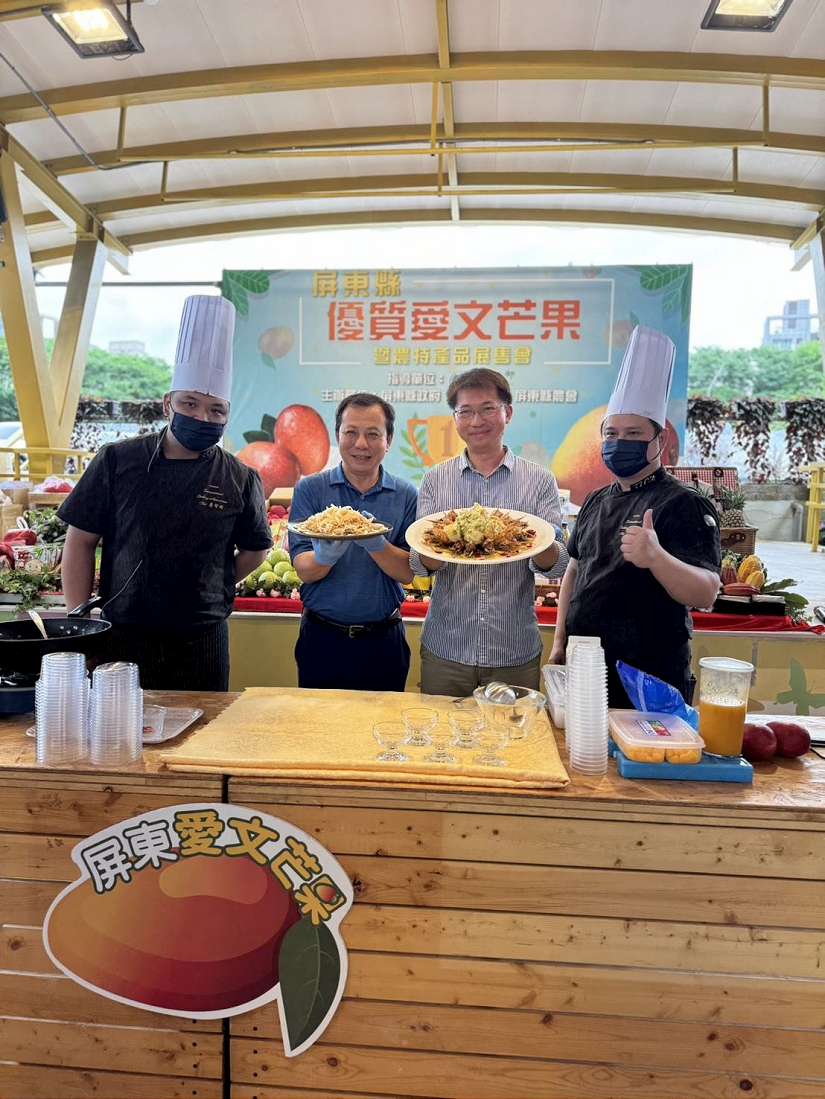 接著是「屏東芒果金獎果饗快閃」,邀請屏東縣優質愛文芒果評鑑剛出爐的冠、亞、季軍農友共同到現場參加展售,他們的芒果不僅色彩鮮豔、香氣撲鼻,外觀更是讓民眾愛不釋手。