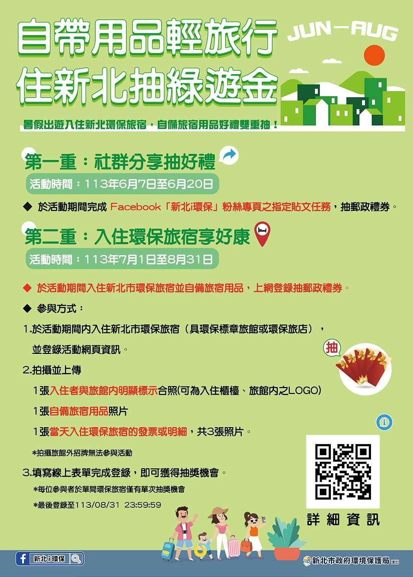 響應6月5日世界環境日,新北市環保局舉辦「自帶用品輕旅行 住新北抽綠遊金」活動,鼓勵民眾在出遊時養成自備盥洗用品及個人衛生物品等備品的習慣,落實綠色旅遊與減塑生活。本次活動分二階段進行,第一階段號召民眾「線上響應」,只要於6月7日至6月20日期間在「新北i環保」Facebook粉絲專頁活動貼文完成指定步驟,即可參加抽獎;第二階段為「落實不塑行動」,民眾於暑假期間(7月1日至8月31日)自備旅宿用品入住新北市任一家環保旅宿,並完成拍照上傳的指定任務,就可參加抽獎,最高可獲得新臺幣1萬元的「綠遊金」,歡迎民眾一起加入綠色旅遊的行列。