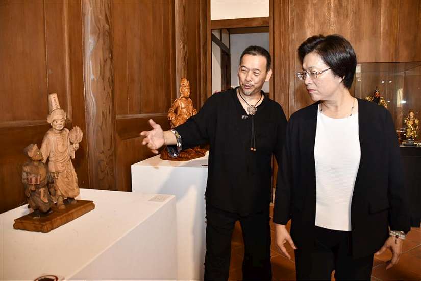 柯錦中老師表示,感謝王惠美縣長縣府團隊的邀請來展覽,這次展出的作品有榮獲文化部「2023A+文化資產獎」工藝類金獎在展館中間的關聖帝君,還有神尊廣澤尊王、千里眼、順風耳、觀世音菩薩等許多獲獎作品,以及12婆姐系列等等。傳統工藝中,粧佛技藝工法是較複雜的項目,包括宗教科儀(開斧、開光、點眼等),西佛國是泉州派傳統粧佛技藝的主流名門,而粧佛是傳統佛神像雕刻的一種技藝,西佛國門脈傳承下來,傳承並發揚光大,除了保留傳統工藝以外,近年來更從古法中進行改良,運用當代的材料,做出創新的作品,同時也投入現代雕刻創作,感謝大家的蒞臨指教。