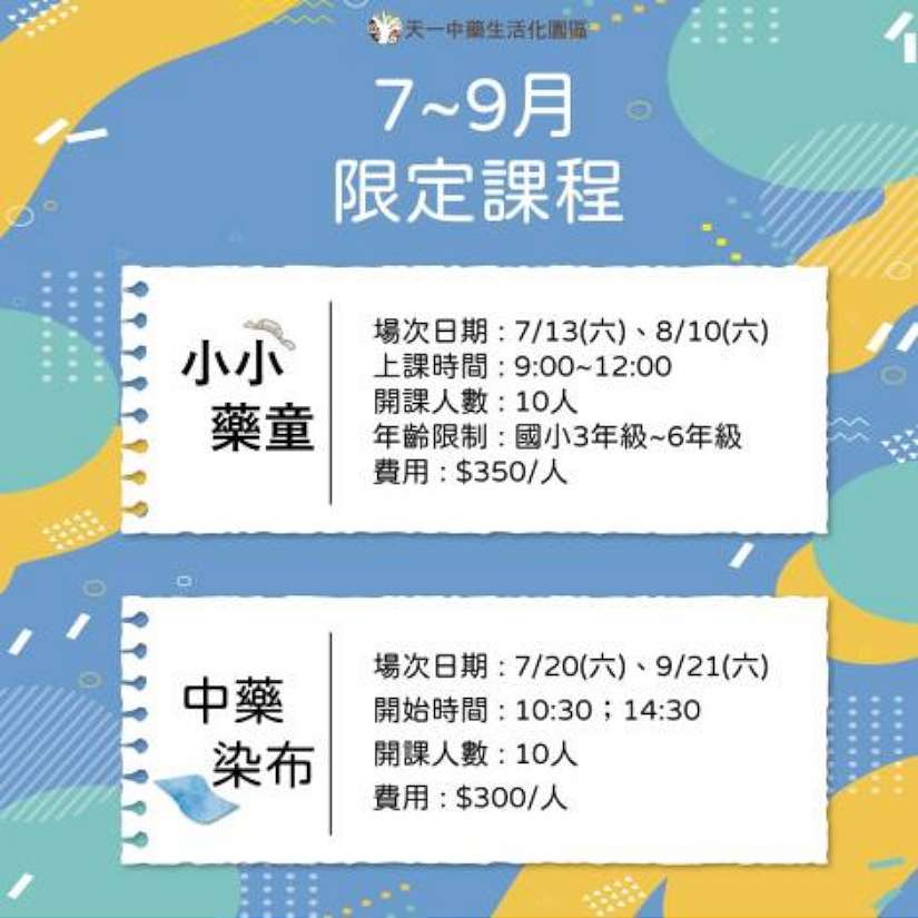 7-9月份暑假期間除推出限定課程「小小藥童」與「中藥染布」體驗活動外,也可以選擇淨化空氣、防範蚊蟲的「中藥花露水」及「蚊蟲bye bye香包」等DIY體驗活動,適合親子從參觀與體驗中輕鬆學習中藥知識,園區有專業的導覽人員在仿古藥房內為您解說,另有各種傳統煎藥工具和珍稀中藥材展示,當然也有現代化的無塵生產線,歡迎闔家大小一同來「天一中藥生活化園區」探索中藥世界。