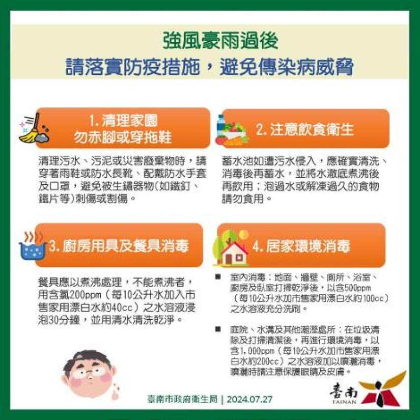 凱米颱風雖已遠離台灣,但中南部仍可能有劇烈豪雨發生,導致部分地區積水或淹水,環境易受汙染,台南市府請民眾務必注意家園、飲食衛生,並落實消毒方式。